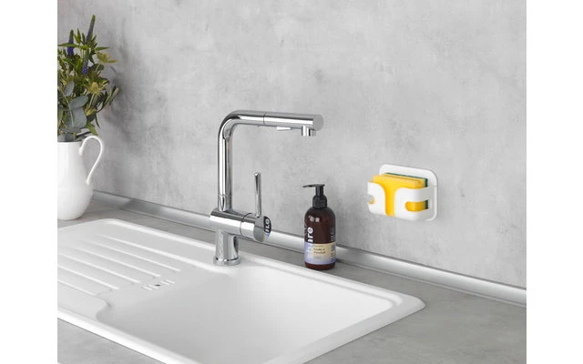 El soporte decorativo de plástico blanco puede colocarse en cualquier lugar y así la esponja está siempre al alcance de la mano