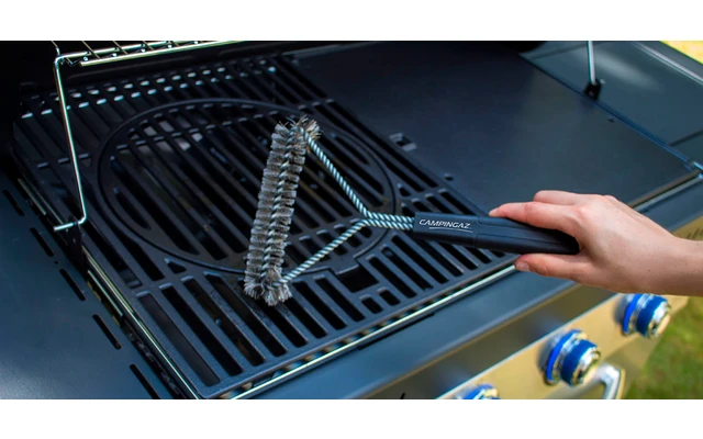 El cepillo triangular de acero inoxidable permite limpiar de forma fácil y sencilla los espacios entre las rejillas y los lugares de difícil acceso en los bordes de la superficie de la parrilla.