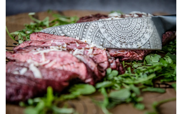 Los cuchillos buenos y robustos no son territorio nuevo para el conocido artista del tatuaje Henk Schiffmacher. Este cuchillo de chef está fabricado en una sola pieza de acero inoxidable alemán macizo y ennegrecido con un tratamiento especial de óxido de hierro. Y no sería una navaja Schiffmacher sin un tatuaje, ¿verdad? «Al igual que el ser humano, el cuchillo también tiene alma. Este diseño de inspiración polinesia encarna esa alma y le da fuerza».