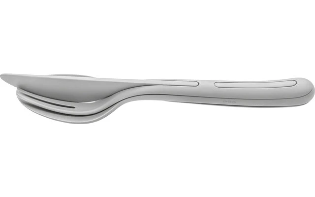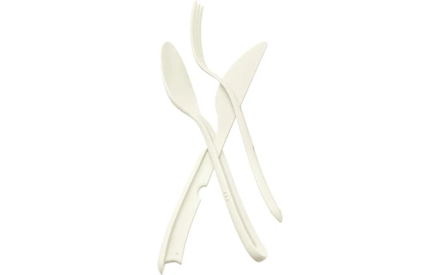 La cubertería perfecta para el exterior y los desplazamientos, en un tamaño muy cuidado El cuchillo, el tenedor y la cuchara pueden introducirse unos en otros; para soltarlos, basta con levantar el cuchillo por la punta y tirar de él hacia abajo. Se adapta cómodamente a la mano y cabe en cualquier bolsillo gracias a su ligereza. Reutilizable.
