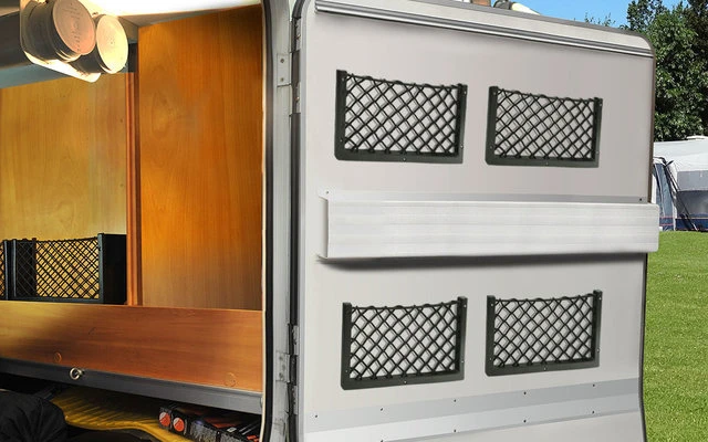 Red de almacenamiento universal para caravanas, autocaravanas y barcos, que proporciona espacio adicional para guardar libros, botellas y muchos otros accesorios de viaje útiles. Los cinco puntos de fijación del marco de plástico permiten montar la red en cualquier lugar. Montaje con tornillos.