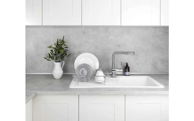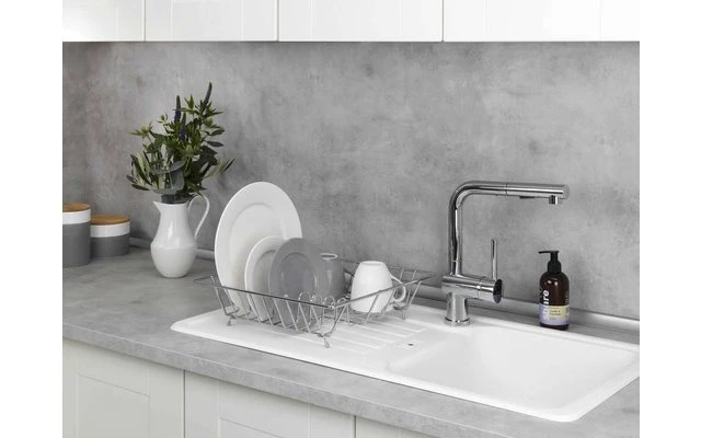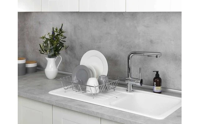 El cesto escurreplatos de metal cromado ofrece una extensión sencilla y que ahorra espacio a la repisa del fregadero para platos, tazas y vasos. La vajilla lavada tiene un lugar ideal para secarse rápidamente. Como accesorio funcional, no sólo realza el fregadero de la cocina, sino que también puede utilizarse en la zona de cocina de la casa de verano o la casa móvil.